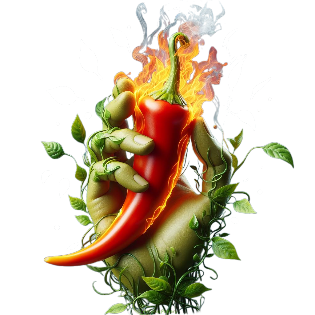 De afdruk is een hand omringt door takken en bladeren die een peper vast heeft die bovenaan in brandt staat, dit geeft aan dat het een pittige peper is.