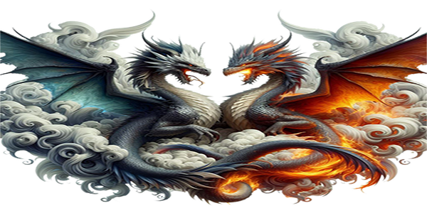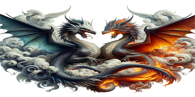 De afbeelding toont twee imposante draken die elkaar in een dramatische scène confronteren. De ene draak heeft blauwe en witte schubben met majestueuze blauwe vleugels, terwijl de andere draak vurige rode en oranje schubben en vlammende vleugels heeft. Ze bewegen dynamisch door de wervelende wolken, en hun staarten lijken met elkaar verweven te zijn. De contrasten tussen koel blauw en fel rood zorgen voor een krachtige, visueel indrukwekkende compositie. Een epische strijd of een mystieke dans
