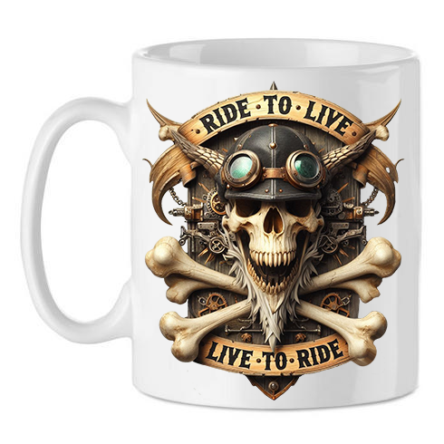 De afbeelding toont een imposante schedel die een vintage motorbril en leren cap draagt, omringd door elementen die doen denken aan een houten schild of embleem. Boven de schedel staat op een houten banner "RIDE TO LIVE", en onderaan, gekruist met twee forse botten, staat "LIVE TO RIDE". De schedel heeft een agressievere uitstraling met ontblote tanden, en aan weerszijden zijn vleugelachtige of hoornachtige structuren te zien, samen met industriële details zoals tandwielen en kettingen. Dit ontwerp combineert ruige biker-esthetiek met een steampunk-achtige flair en een gevoel van tijdloze avontuurlijkheid.