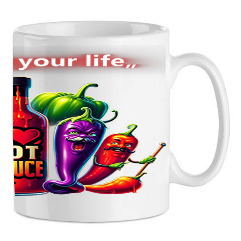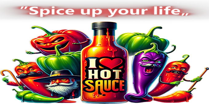Deze levendige afbeelding toont een reeks karaktervolle, geanimeerde pepers in diverse kleuren en vormen – van de charmante, snorrende rode pepers tot de mysterieus paarse en vrolijk groene exemplaren. Centraal staat een uitnodigende fles hete saus met de duidelijke boodschap 'I ❤️ HOT SAUCE'. De afbeelding straalt plezier, smaak en een beetje ondeugendheid uit, perfect om de sfeer op te warmen en te laten zien dat je van een beetje pit houdt!
