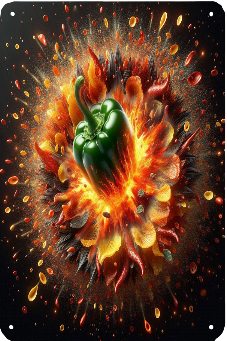 Ervaar de Explosie van Smaak: De Pittige Kern! Deze dynamische en adembenemende afbeelding toont een stralende groene paprika die het epicentrum is van een spectaculaire uitbarsting van vlammen, spatten en kleurrijke deeltjes. De intense oranje, rode en gele tinten van de explosie contrasteren prachtig met het frisse groen van de paprika, wat een gevoel van zowel hitte als versheid creëert. De rondvliegende deeltjes, sommige lijkend op kruiden of vloeistof, dragen bij aan de energie en de impact van de compositie. Deze afbeelding is perfect om de krachtige smaak, de intense hitte of de frisse, levendige kwaliteit van uw producten te benadrukken en klanten te boeien met een visueel spektakel.