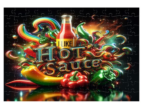 I Like Hot Sauce Puzzel - Levendige Neon Peper Party - Dompel jezelf onder in een explosie van kleur en pittigheid met deze "I Like Hot Sauce" puzzel! Het dynamische ontwerp toont een centrale fles hete saus, omlijst door de pakkende tekst "I LIKE HOT SAUCE" in glanzende, metallic letters. Rondom wervelen kleurrijke, regenboogachtige slierten, aangevuld met diverse verse pepers in levendige tinten zoals rood, groen en geel. De donkere achtergrond is doorspekt met neon-achtige gloed en sprankelingen, wat het geheel een moderne en energieke uitstraling geeft. Deze puzzel belooft een uitdagende en visueel stimulerende ervaring, perfect voor liefhebbers van pittig eten, pop-art, of iedereen die van een unieke en levendige puzzeluitdaging houdt!