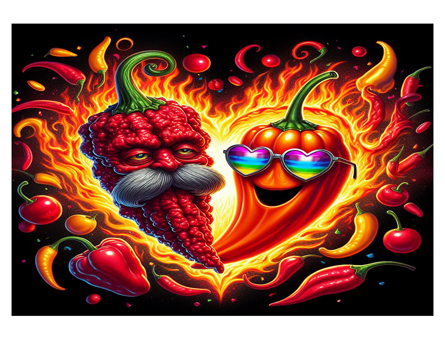 Spicy Heart Duo Puzzel - Liefde voor Hitte - Verwarm je hart (en je zintuigen!) met deze "Spicy Heart Duo" puzzel! De afbeelding toont twee expressieve, geanimeerde chilipepers die samen een hartvorm vormen, omgeven door vlammen en een regenboog aan kleinere pepers en hete spetters. Links zien we een dieprode peper met een wijze, grijze snor en vriendelijke ogen, terwijl rechts een vrolijk oranje-gele peper met een brede lach en coole hartvormige zonnebril prijkt. De donkere achtergrond benadrukt de levendige kleuren en de vurige sfeer. Deze puzzel, met zijn zichtbare puzzellijnen, belooft een leuke en uitdagende ervaring, perfect voor liefhebbers van pittig eten, romantische humor, of iedereen die van een 'hete' en hartverwarmende puzzeluitdaging houdt!