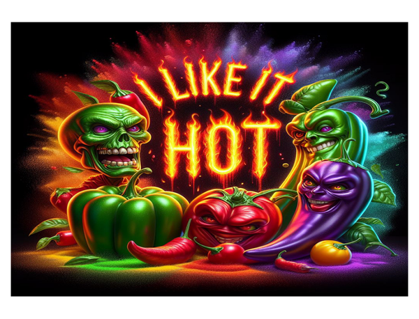 I Like It HOT Puzzel - Pittige Monsters Feest - Bereid je voor op een explosie van kleur en hitte met de "I Like It HOT" puzzel! De afbeelding is een levendige viering van pittigheid, met de gloeiende tekst "I LIKE IT HOT" prominent in het midden, omgeven door een feest van geanimeerde groenten. Je ziet een reeks expressieve paprika's en pepers in diverse kleuren – groen, rood en paars – die elk een uniek, monsterlijk en komisch gezicht hebben. Vlammen en spetters in heldere neonkleuren spatten rondom, wat de intense energie van het design benadrukt. Deze puzzel, met zijn zichtbare puzzellijnen, belooft een uitdagende en vermakelijke ervaring, perfect voor liefhebbers van pittig eten, speelse karakters, of iedereen die van een 'hete' en kleurrijke puzzeluitdaging houdt!