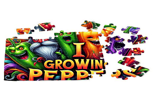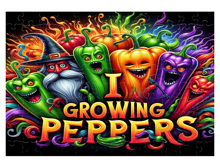 Growing Peppers Puzzel - De Heksen- & Monstersoogs - Ga de uitdaging aan met de betoverende en pittige "Growing Peppers" puzzel! De afbeelding toont een bruisende verzameling van geanimeerde paprika's en chilipepers die elk een uniek, expressief gezicht hebben. Centraal staat het woord "I GROWING PEPPERS" in een speels lettertype, omringd door een rijke mix van vlammen en spetters in diverse kleuren. Je ontdekt pepers met heksenhoeden, snorren, en monsterlijke lachjes, waaronder een wijze grijze tovenaar-peper en vrolijk lachende varianten. De donkere achtergrond benadrukt de levendige neonkleuren en de energie van de karakters. Deze puzzel, met zijn zichtbare puzzellijnen, belooft urenlang vermakelijk en uitdagend puzzelplezier, perfect voor liefhebbers van unieke kunst, pittige humor, of iedereen die van een 'hete' en magische puzzeluitdaging houdt!