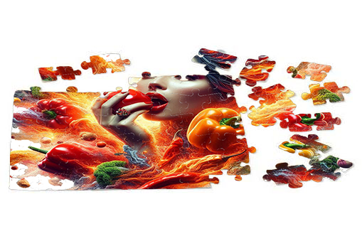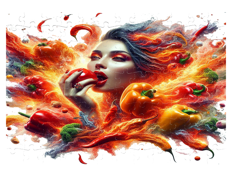 Spicy Smaak Explosie Puzzel - Vurige Verleiding - Laat je zintuigen prikkelen met de "Spicy Smaak Explosie" puzzel! De afbeelding toont het gezicht van een vrouw, omgeven door een dynamische en vurige werveling van oranje, rode en groene vlammen, gecombineerd met diverse paprika's en chilipepers. De vrouw, met intense ogen en volle lippen, brengt een glanzende rode paprika naar haar mond, wat de sensatie van pittigheid benadrukt. Het geheel is een explosie van kleur en energie, met spetters en de kenmerkende puzzellijnen die de uitdaging verhogen. Deze puzzel is perfect voor liefhebbers van pittig eten, dynamische kunst, of iedereen die van een 'hete' en uitdagende puzzelervaring houdt!