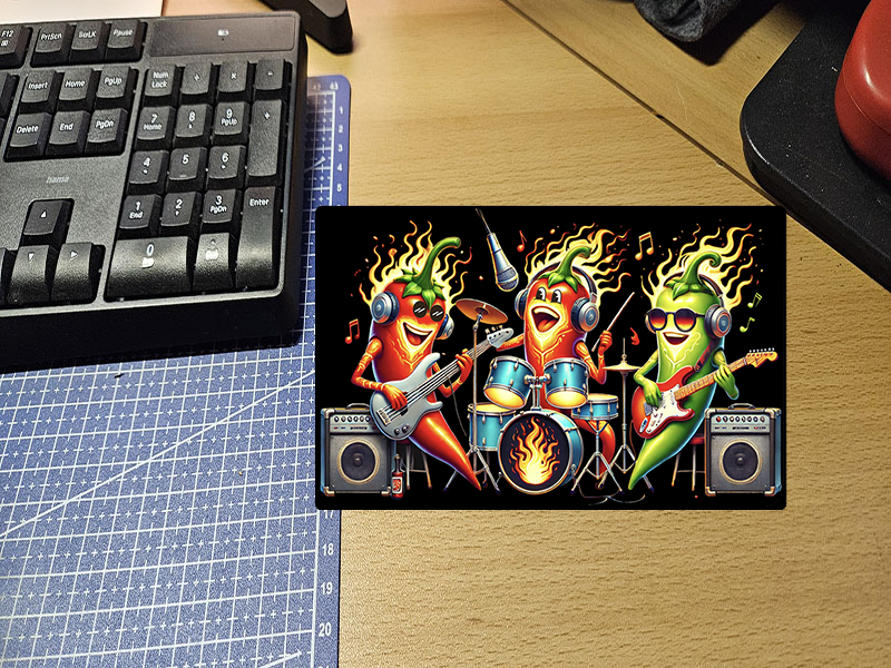 De Hete Peper Band - Pittige Performance - Deze levendige en energieke afbeelding toont een cartoonband bestaande uit drie vrolijke en "hete" pepers. Elke peper is afgebeeld met vlammen die uit hun hoofden komen, wat hun pittige karakter benadrukt. De linker peper speelt een zilveren elektrische gitaar, de middelste peper zit achter een drumstel en zingt in een microfoon, en de rechter peper bespeelt een rode elektrische gitaar. Ze dragen allemaal koptelefoons of een zonnebril, wat hun rockster-status onderstreept. Op de achtergrond is een donkere gloed te zien, en aan weerszijden van de band staan speakers. De afbeelding straalt plezier, muziek en een vleugje ondeugende pittigheid uit, perfect voor liefhebbers van unieke en humoristische decoraties.