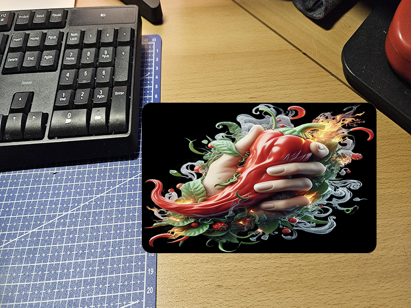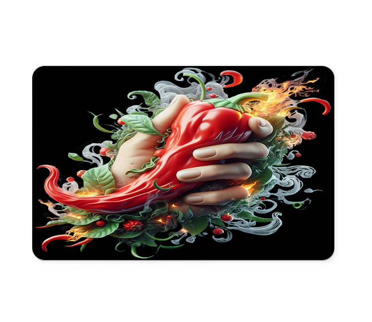 De Vurige Chili in Groene Greep - Deze dynamische afbeelding toont een krachtige hand die stevig een grote, levendig rode chilipeper vasthoudt. Rondom de peper en de hand wervelen groene bladeren, kleine rode besjes en delicate witte rookpluimen, wat een gevoel van beweging en intensiteit creëert. Aan de rechterkant van de peper en de bladeren zijn vlammen te zien, wat de "vurige" aard van de chili benadrukt. Dit alles is afgezet tegen een strakke zwarte achtergrond, waardoor de kleuren en details extra opvallen. De afbeelding straalt passie, kracht en een pittige energie uit, perfect voor liefhebbers van gedurfde en expressieve designs.