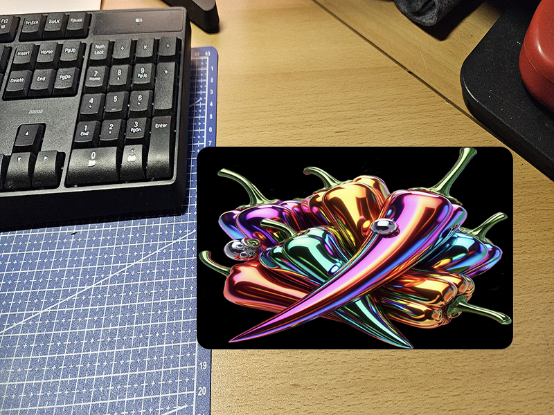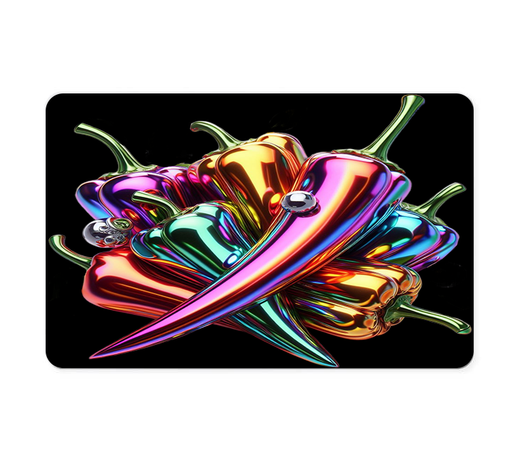 Iridescent Chili's - Abstracte Vurige Glans - Deze opvallende afbeelding toont een stapel glanzende pepers in een abstracte, metalen afwerking. De pepers reflecteren een spectrum aan iriserende kleuren, waaronder paars, roze, goud, blauw en groen, wat een futuristisch en luxueus uiterlijk geeft. Sommige pepers zijn gedecoreerd met kleine zilverkleurige bolletjes, wat een extra dimensie en detail toevoegt. De glanzende, bijna vloeibare textuur van de pepers contrasteert prachtig met de strakke zwarte achtergrond, waardoor de focus volledig op de unieke vormen en kleuren ligt. Deze afbeelding straalt moderniteit, kunstzinnigheid en een gedurfde stijl uit, perfect voor liefhebbers van eigentijdse en opvallende designs.