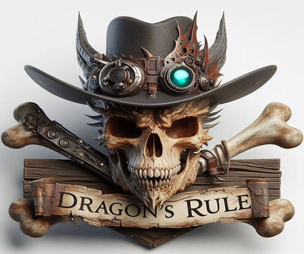 Stap in de wereld van ruige avonturen met dit indrukwekkende "De Heerschappij van de Draak: Outlaw Editie" design. Een gedetailleerde, angstaanjagende schedel is het middelpunt, getooid met een cowboyhoed vol steampunk details en oplichtende goggles. De gekruiste botten achter de schedel versterken de rebelse sfeer, terwijl de "DRAGON'S RULE" banner duidelijk maakt wie de dienst uitmaakt. Een absolute must-have voor degenen die buiten de lijntjes kleuren en hun drankjes met een dosis lef willen presenteren.