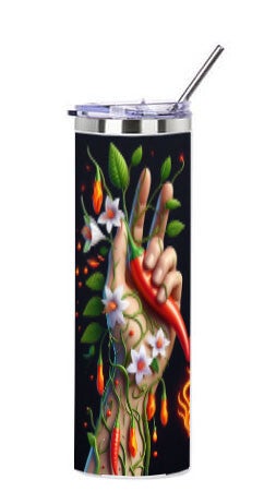 Laat je dag opfleuren met de 'Chili Bloesem Harmonie Beker'! Dit kunstzinnige design op je tumbler presenteert twee handen die opgroeien uit een organisch stelsel van takken en bladeren, versierd met stralende witte bloemen en verschillende soorten pepers. De handen houden twee levendige rode chilipepers vast, gericht naar het midden, wat een gevoel van eenheid en energie creëert. Onder hen gloeit een klein, stijlvol vlammenicoon. Deze beker is ideaal voor liefhebbers van botanische schoonheid en de levendige energie van pepers, en is perfect voor het koel houden van je verfrissende drankjes of het warm houden van je thee, elke dag weer.