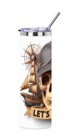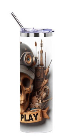 Start je avontuur met onze Let's Play: De Avontuurlijke Machinist Schedel tumbler! Dit fascinerende ontwerp toont een robuuste schedel, getooid met een stoere pet en een futuristisch oorstuk met een speaker en tandwielen. De schedel zelf is omringd door een eclectische mix van maritieme en industriële elementen: links een klassiek zeilschip en een stuurwiel, rechts een complex stoom-aangedreven schip met pijpen en mechaniek. De hele compositie rust op een houten spandoek met de uitnodigende woorden 'LET'S PLAY', uitgesneden in het hout. Deze tumbler is perfect voor de speelse avonturier, de liefhebber van steampunk en nautische verhalen, en houdt je drankjes stijlvol warm of koud terwijl je je eigen regels maakt.