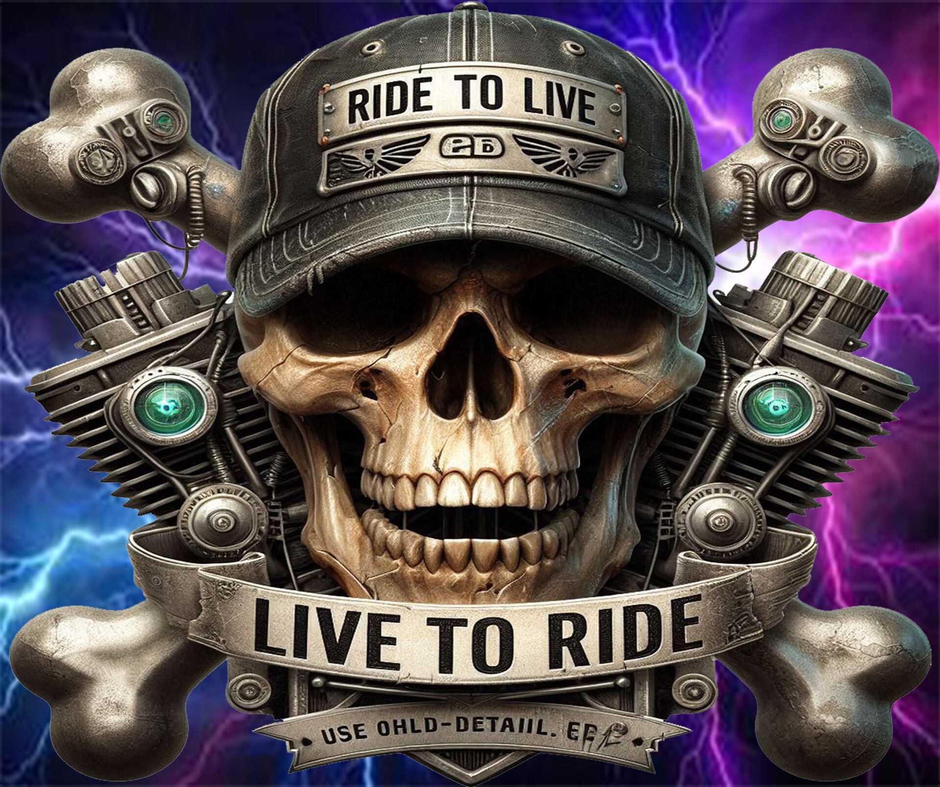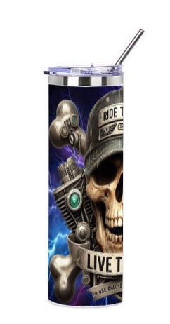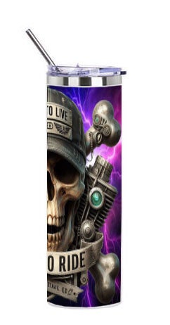 Laat de weg je roepen met onze 'Bliksem Rider Schedel' tumbler! Dit krachtige ontwerp toont een dreigende schedel, getooid met een stoere pet waarop de woorden 'RIDE TO LIVE' prijken, geflankeerd door vleugels. Aan weerszijden van de schedel bevinden zich gedetailleerde motorblokken met gloeiende groene accenten, wat de rauwe kracht van de open weg symboliseert. Onder de schedel kruisen twee robuuste botten elkaar, met daarop een metalen lint met de boodschap 'LIVE TO RIDE'. De achtergrond wordt verlicht door dynamische, paarse en blauwe bliksemschichten, wat zorgt voor een explosieve uitstraling. Deze tumbler is een must-have voor motorliefhebbers en iedereen die leeft voor de vrijheid van de rit, en houdt je drankjes stijlvol warm of koud, ongeacht de weersomstandigheden.