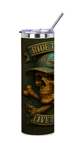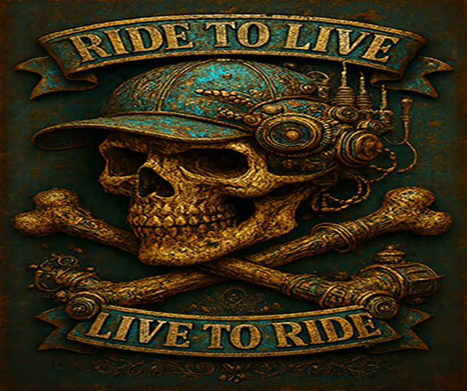 Laat je liefde voor het motorrijden zien met deze unieke, verouderde look! Deze afbeelding toont een gedetailleerde schedel in een rijke gouden tint, getooid met een stoere pet in een prachtige turquoise patina afwerking, versierd met steampunk-achtige elementen. Onder de schedel kruisen twee botten die naadloos opgaan in het geheel. Boven en onder de centrale afbeelding prijkt de iconische spreuk 'RIDE TO LIVE - LIVE TO RIDE' op bijpassende patinabanden. De diepe, donkergroene achtergrond met subtiele textuur geeft het geheel een authentieke, vintage uitstraling. Een absolute must-have voor de motorliefhebber met oog voor detail!
