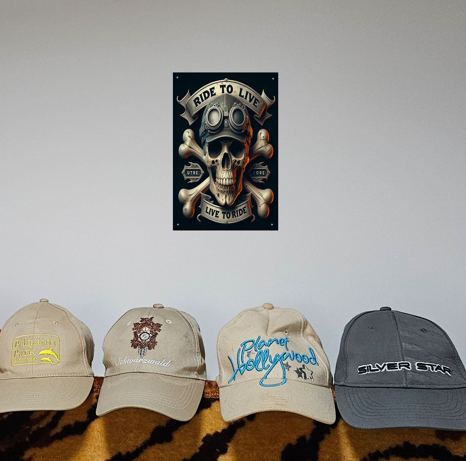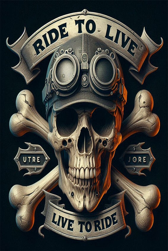 Dit opvallende embleem toont een gedetailleerde schedel, getooid met een klassieke pilotenbril en muts, wat de geest van vrijheid en avontuur oproept. Achter de schedel kruisen twee robuuste botten, wat een klassiek doodshoofd-motief creëert. Boven de schedel wappert een sierlijke banner met de inspirerende tekst "RIDE TO LIVE", en daaronder een tweede banner met "LIVE TO RIDE", wat de diepe verbinding met de motorcultuur benadrukt. Links en rechts zijn er kleinere, gestileerde labels met de woorden "UTRE" en "JORE", die extra personalisatie of merkelementen kunnen zijn. De algehele esthetiek is stoer en nostalgisch, perfect voor liefhebbers van motoren, rockabilly of een robuuste, vintage look.