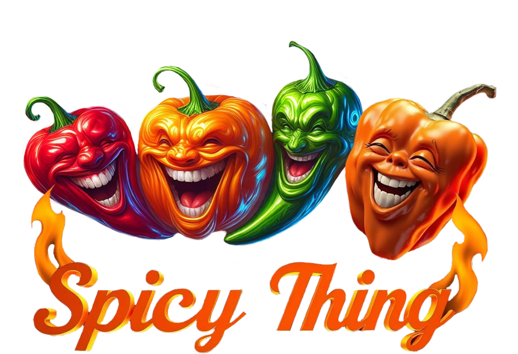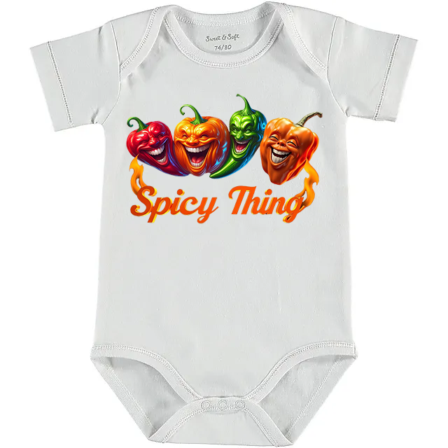 Dit vrolijke en kleurrijke ontwerp toont een rij lachende pepers in verschillende kleuren: rood, oranje en groen, elk met een brede, hilarische lach en glimmende tanden. De speelse uitdrukkingen van de pepers geven een leuke en energieke sfeer. Onder de rij pepers staat de tekst "Spicy Thing", omringd door kleine vlammen, wat het pittige en tegelijkertijd grappige karakter van het ontwerp benadrukt. Een perfect rompertje voor de kleinste 'spicy' persoonlijkheden die al vroeg van wat humor houden!