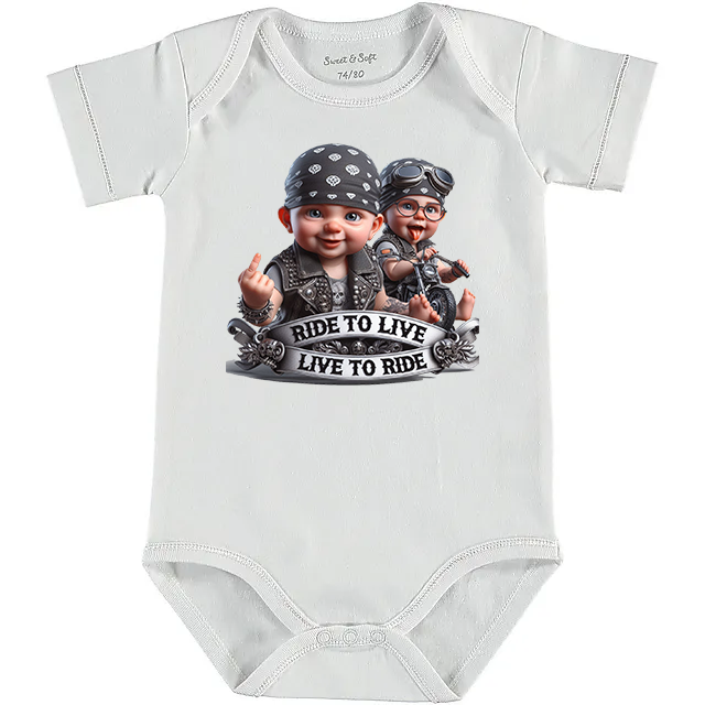 Deze onweerstaanbaar schattige en stoere afbeelding toont twee baby's, elk met grote vleugels, gekleed als kleine motorrijders. De linker baby heeft een lieve lach en draagt een bandana en een vest vol studs. De rechter baby, met brilletje en uitgestoken tong, zit op een miniatuur motorfiets. Beide dragen stoere leren vestjes met skulls en tatoeages. Onder hen prijkt een gedetailleerde banner met de iconische biker-slogans "RIDE TO LIVE" en "LIVE TO RIDE". Een perfect rompertje voor de kleinste met een grote persoonlijkheid en een passie voor avontuur en vrijheid!