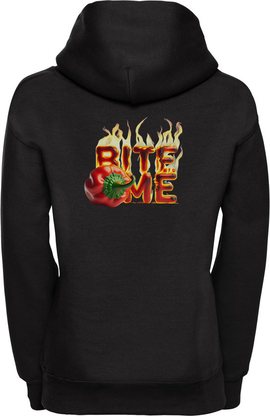 Voel de hitte met onze 'Bite Me Chili Hoodie'! Dit zwarte sweatshirt heeft een pittige rugprint van een levendige rode Habanero peper naast de uitdagende, vlammende tekst 'BITE ME'. Perfect voor degenen die van een beetje pit houden in hun leven en hun stijl. Gemaakt voor comfort en een gedurfde uitstraling, ideaal voor een casual look met een edgy twist.