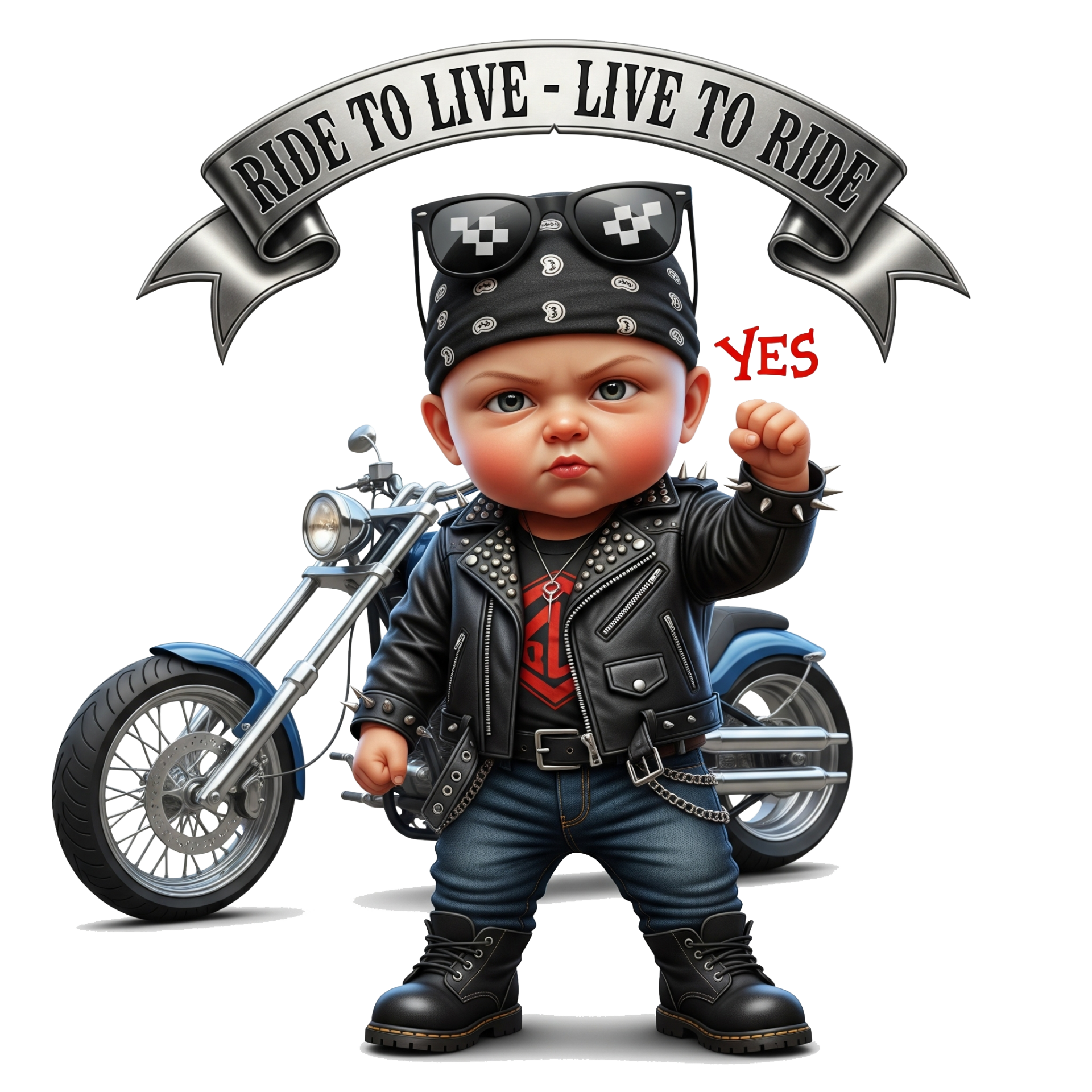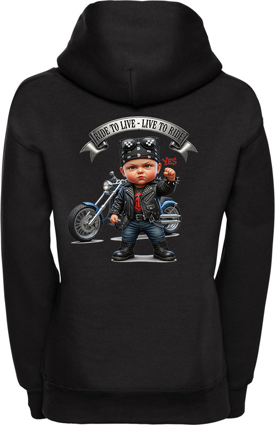 Geef je outfit een dosis stoere charme met onze 'Ride to Live - Live to Ride Hoodie'! Dit zwarte sweatshirt heeft een geweldige rugprint van een cartoonachtige baby, gekleed in een leren jasje, bandana en zonnebril, die trots zijn vuist balt. Achter hem staat een glanzende motorfiets en boven hem wappert een banner met de iconische biker-slogan: 'RIDE TO LIVE - LIVE TO RIDE'. Deze comfortabele hoodie is perfect voor motorliefhebbers, ouders met een gevoel voor humor, of iedereen die van unieke en gedurfde designs houdt. Ideaal voor casual dagen en om je passie voor de open weg te laten zien!