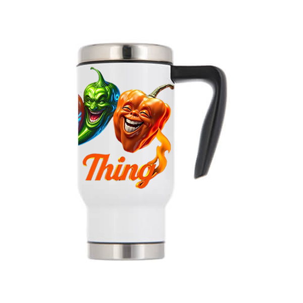 De thermosbeker is wit met zilverkleurige accenten aan de boven- en onderkant, en heeft een zwart handvat. De beker is versierd met meerdere cartoonachtige pepers in verschillende kleuren (rood, oranje, groen) die allemaal breeduit lachen en een levendige, expressieve uitstraling hebben. Sommige pepers lijken vlammen uit hun mond te spuwen of zijn omringd door vlammen, wat het "spicy" thema benadrukt. Onder de lachende pepers staat in oranje letters met een vlammenrand de tekst "Spicy Thing".