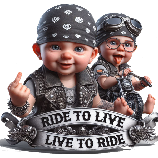 Dit stoere kussen van 40x40cm is perfect voor de jongste motorliefhebbers! De afbeelding toont twee schattige baby's verkleed als stoere bikers. De ene baby draagt een bandana en een leren vestje met studs, terwijl de andere een motorbril en vestje draagt en op een miniatuurmotor zit. Onder de baby's is een banner te zien met de iconische motor spreuk: "RIDE TO LIVE LIVE TO RIDE". De zwarte rand met witte spetters geeft het kussen een ruige, maar toch speelse uitstraling. Een geweldig cadeau voor nieuwe ouders met een passie voor motoren, of als een leuke toevoeging aan een kinderkamer met een eigenzinnig thema!