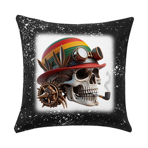 Dit unieke kussen van 40x40cm combineert speels verschillende stijlen. Het centrale beeld toont een schedel die een hoed draagt in de rasta-kleuren rood, geel en groen, versierd met steampunk-achtige brillen en tandwielen. Er zijn ook bladvormige elementen te zien die geïnspireerd zijn op cannabisbladeren. Uit de mond van de schedel steekt een rokende pijp, wat een relaxte sfeer oproept. De zwarte rand met witte spetters geeft het geheel een stoere en artistieke uitstraling. Dit kussen is perfect voor liefhebbers van unieke esthetiek, alternatieve kunst, of als een gedurfd en eigenzinnig decoratief item in elke informele ruimte.