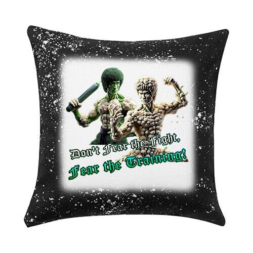 Dit humoristische kussen van 40x40cm is een knipoog naar fitness en gezond eten. Het ontwerp toont twee gespierde figuren, elk opgebouwd uit groenten: de ene met een broccolihoofd en lichaam, de andere met een bloemkoolhoofd en -lichaam. De broccolifiguur lijkt een komkommer als wapen vast te houden, terwijl de bloemkoolfiguur zijn spierballen showt. Onder de figuren staat de motiverende en grappige tekst "Don't Fear the Fight, Fear the Training!" in groene letters. De zwarte rand met witte spetters geeft het kussen een stoere en energieke uitstraling. Perfect voor sporters, liefhebbers van gezond eten, of iedereen die een vleugje humor aan zijn interieur wil toevoegen.