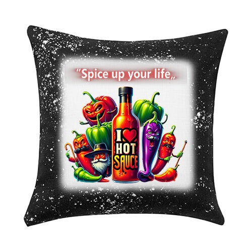 Dit levendige kussen van 40x40cm is een kleurrijke ode aan de liefde voor pittig eten! Het centrale ontwerp toont een fles "I ❤️ HOT SAUCE" te midden van een vrolijke groep geanimeerde pepers in diverse vormen en kleuren – rood, groen, paars. Elke peper heeft een unieke, expressieve gezichtsuitdrukking, variërend van stoer met een snor en hoed tot ondeugend lachend. Bovenin prijkt de motiverende tekst "Spice up your life," in rode letters. De zwarte rand met witte spetters geeft het kussen een energieke en speelse uitstraling. Perfect voor liefhebbers van pittige smaken, koken, of als een grappig en kleurrijk accent in de keuken of woonkamer.