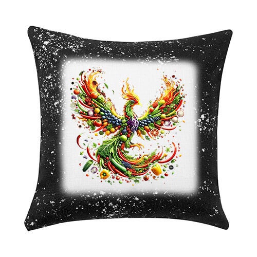 Dit prachtige kussen van 40x40cm is een ware explosie van kleur en vitaliteit! Het centrale ontwerp toont een majestueuze feniks, volledig samengesteld uit een overvloed aan levendige groenten en fruit. Van knapperige groene bladeren en sappige rode bessen tot heldere oranje paprika's en blauwe druiven, de feniks straalt in alle kleuren van de regenboog. Rondom de vogel zweven meer kleine stukjes groenten en fruit, wat de dynamiek van het ontwerp versterkt. De zwarte rand met witte spetters geeft het kussen een moderne en artistieke uitstraling. Perfect voor liefhebbers van gezonde voeding, natuur, of als een kleurrijk en inspirerend accent in elke kamer.