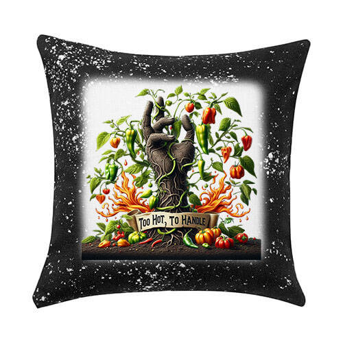 Dit mystieke kussen van 40x40cm is een boeiend decoratief item. Het centrale ontwerp toont twee tegenovergestelde draken – de ene zwart en de andere oranje/rood, verstrengeld in een dynamische cirkel van vuur. Dit intense tafereel wordt omhoog gehouden door twee grote, groene, wortelachtige handen, die verder naar beneden uitlopen in ranken met groene bladeren en kleine rode pepers. De zwarte rand met witte spetters geeft het geheel een rauwe en magische uitstraling. Dit kussen is perfect voor liefhebbers van fantasie, draken, en symbolische kunst, en voegt een vleugje mystiek en kracht toe aan elke kamer.