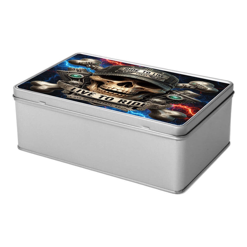 Deze metalen opbergdoos (19,8 x 12,8 x 7,2 cm) is voorzien van een robuust en iconisch ontwerp voor motorliefhebbers. De afbeelding toont een gedetailleerde schedel die een pet draagt met de tekst 'RIDE TO LIVE'. Achter de schedel kruisen twee botten, die echter niet zomaar botten zijn; het zijn gedetailleerde motorblokken, compleet met cilinders, koelribben en glimmende onderdelen. Groene, lichtgevende accenten in de ogen van de schedel en op de motorblokken geven een extra, bijna bovennatuurlijke gloed. Rondom het geheel flitsen bliksemschichten in blauw en rood, wat de elektrische energie en snelheid van motorrijden symboliseert. Onder de schedel prijkt een banner met de krachtige leus 'LIVE TO RIDE'. Dit stoere en gedetailleerde ontwerp maakt de doos een perfect cadeau voor elke biker en een stijlvolle opberger voor persoonlijke items.