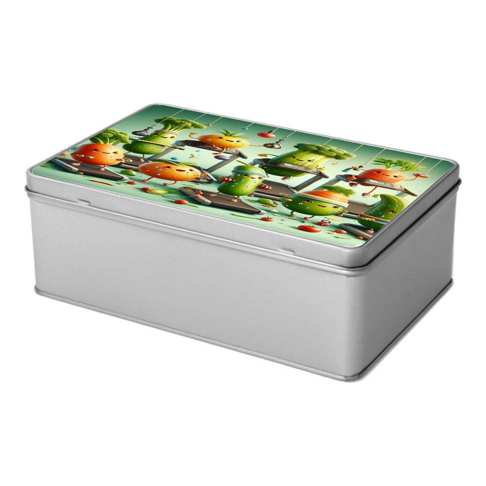Deze metalen opbergdoos (19,8 x 12,8 x 7,2 cm) is versierd met een vrolijke en motiverende afbeelding die de essentie van een gezonde levensstijl op een speelse manier vastlegt. De print toont een reeks diverse groenten als vrolijke cartoonfiguren – waaronder maïs, prei, knoflook en paprika's – die vol enthousiasme trainen in een fitnessruimte. Ze zijn gekleed in sportschoenen en lijken gewichten te heffen of gewoonweg te genieten van hun workout. De afbeelding straalt energie en plezier uit, waardoor het een inspirerende en leuke toevoeging is aan elke keuken, fitnessruimte of als een vrolijke opberger voor kleine items.