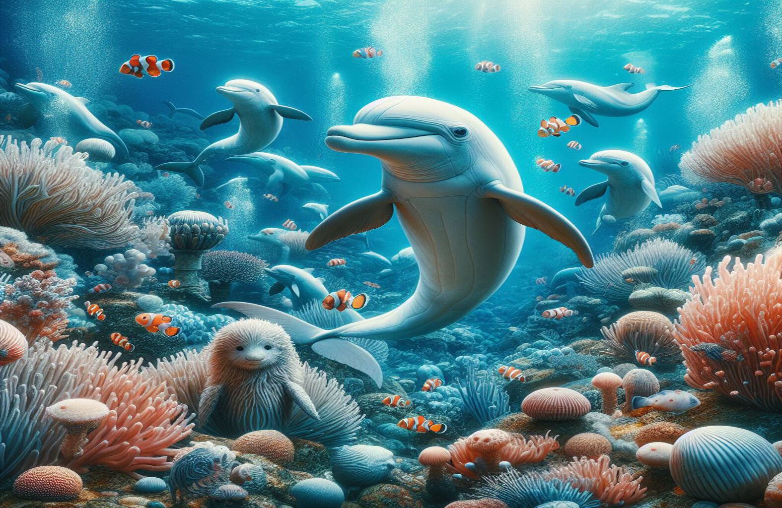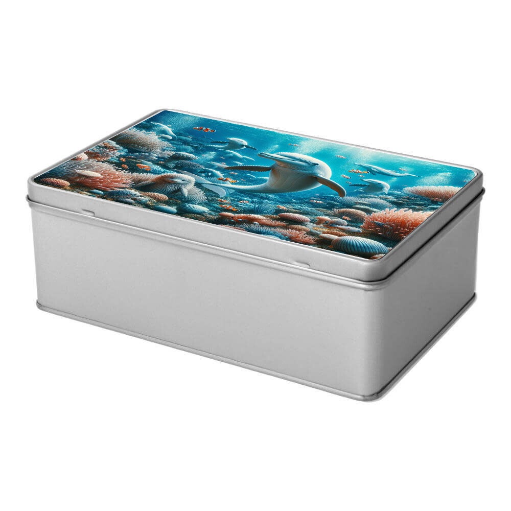 Deze metalen opbergdoos (19,8 x 12,8 x 7,2 cm) is versierd met een levendige en betoverende afbeelding van een bruisende onderwaterwereld. Centraal staat een grote, glimlachende dolfijn die sierlijk door het water glijdt. Rondom de dolfijn zwemmen talloze vrolijke oranje en witte clownvissen, en verschillende andere tropische vissen in uiteenlopende kleuren. De zeebodem is rijkelijk gevuld met diverse soorten koraal in tinten van roze, oranje en blauw, evenals zeeschelpen en andere fascinerende zeedieren zoals zee-egels. Lichtstralen breken door het wateroppervlak, wat een magische en serene sfeer creëert. Dit gedetailleerde en kleurrijke ontwerp maakt de doos een perfecte aanvulling voor elke kamer en is ideaal voor het opbergen van kleine schatten of sieraden, en brengt een stukje tropische oceaan in huis.