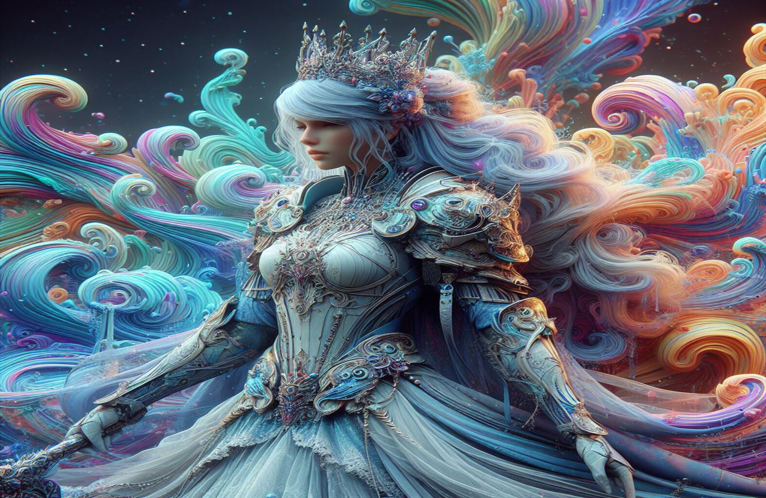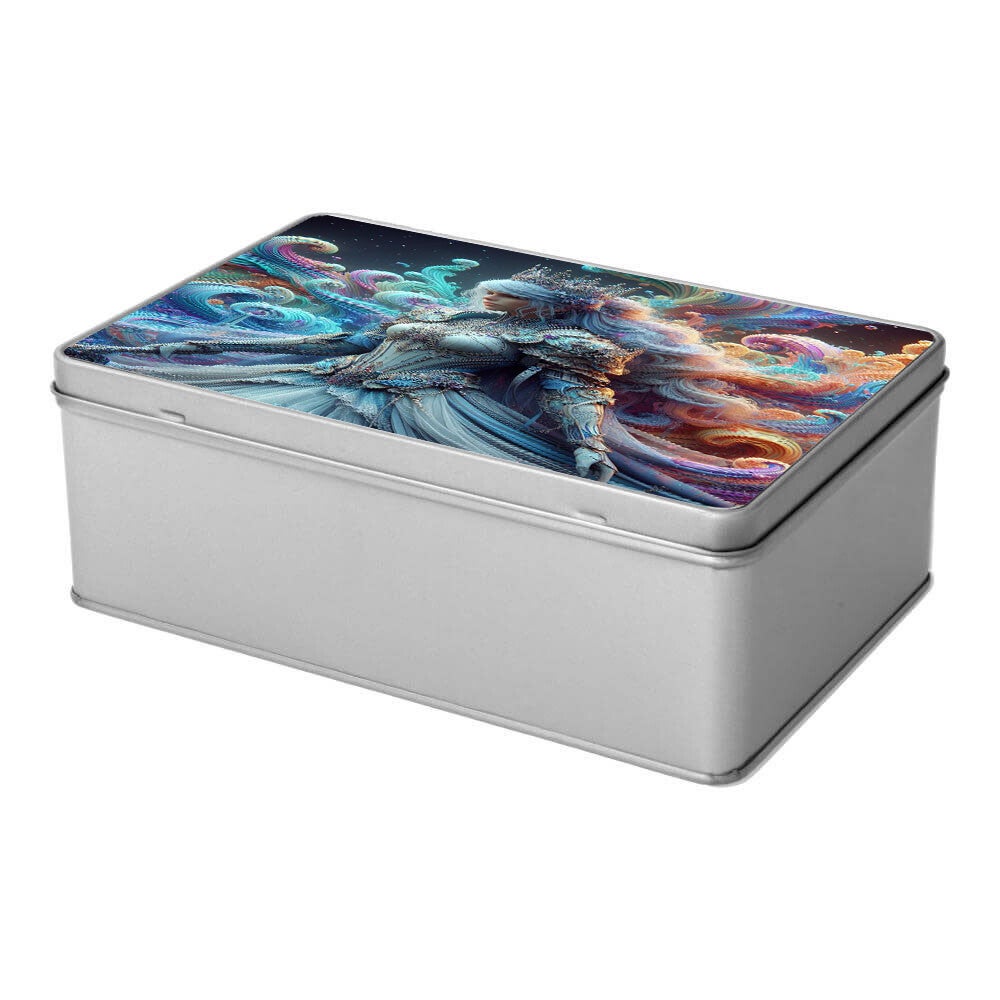 Deze metalen opbergdoos (19,8 x 12,8 x 7,2 cm) is versierd met een betoverende afbeelding van een elegante, etherische vrouw. Ze draagt een sierlijke kroon en een gedetailleerd harnas-achtig korset en jurk in zachte blauw- en wittinten, versierd met gouden en parelmoerachtige accenten. Haar lange, golvende haar vloeit uit in een explosie van levendige, iriserende kleuren zoals roze, oranje, groen en blauw, die lijken op onderwaterstromen of kosmische nevels. De achtergrond is donker met subtiele lichtpuntjes die doen denken aan sterren of diepzee-elementen, wat de mystieke sfeer versterkt. Dit dromerige en kunstzinnige ontwerp maakt de doos een unieke en stijlvolle aanvulling voor liefhebbers van fantasie en mythologie, en is perfect voor het opbergen van waardevolle kleine voorwerpen.