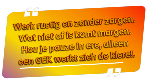 De afbeelding toont een geel-oranje rechthoekig tekstvlak met afgeronde hoeken, geplaatst op een lichtgrijze achtergrond. Bovenin en onderin het tekstvlak staan grote witte aanhalingstekens. De tekst, geschreven in witte letters, luidt: "Werk rustig en zonder zorgen. Wat niet af is komt morgen. Hou je pauze in ere, alleen een GEK werkt zich de klere!."