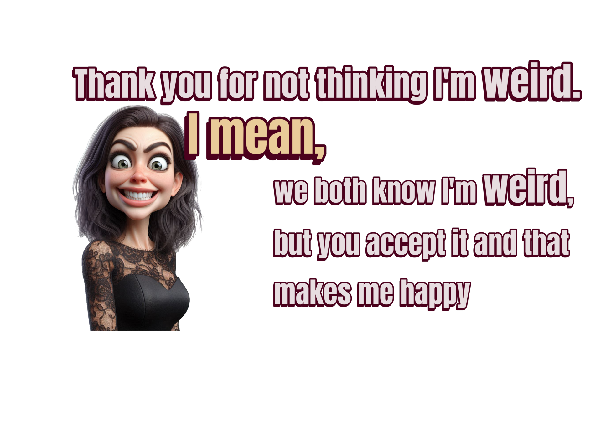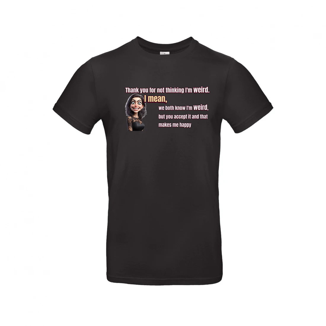 Omarm je unieke zelf met ons 'Heerlijk Raar' T-shirt! Met de pakkende tekst 'Bedankt dat je niet denkt dat ik raar ben. Ik bedoel, we weten allebei dat ik raar ben, maar je accepteert het en dat maakt me blij.' en een expressieve cartoonvrouw, is dit shirt een eerbetoon aan vriendschap en acceptatie. Draag het met trots en laat zien dat 'raar' het nieuwe normaal is.