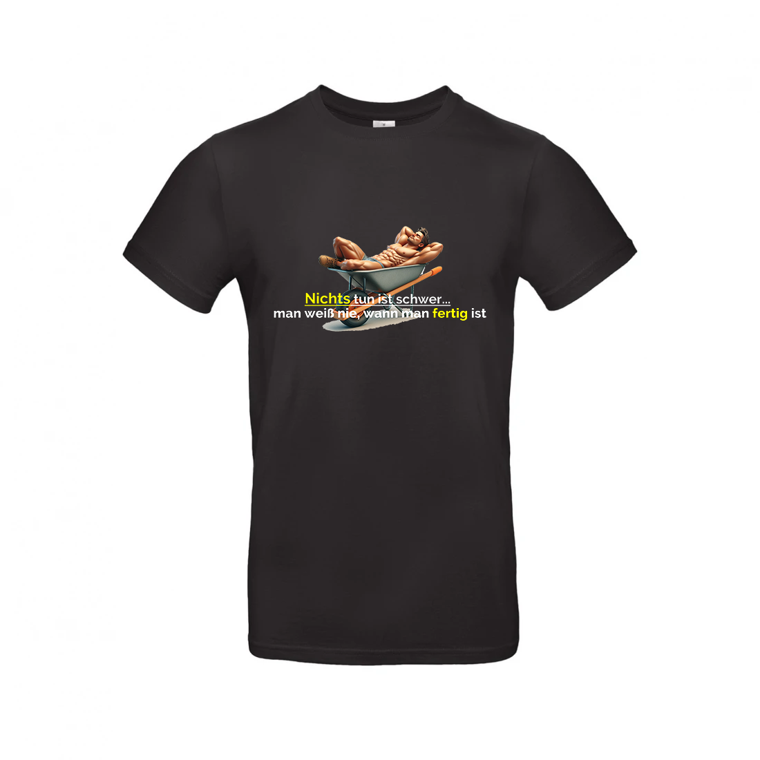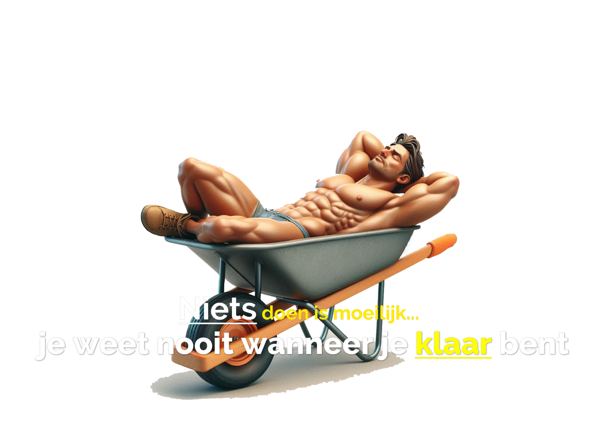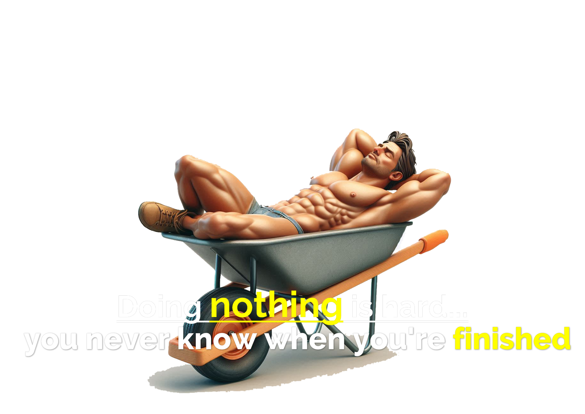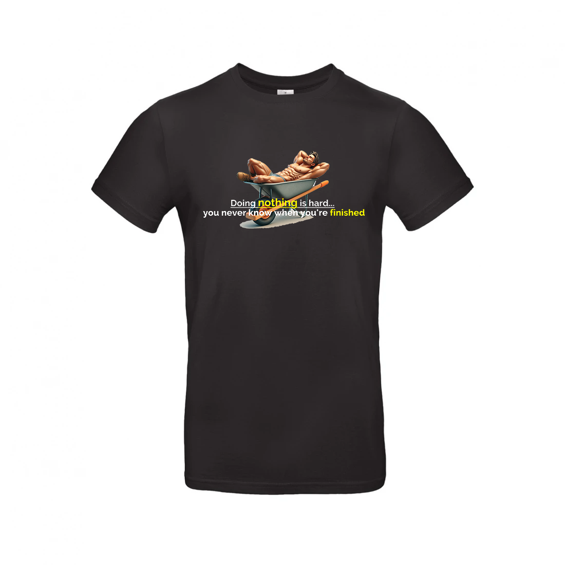 Dit humoristische T-shirt, met een grappige afbeelding van een gespierde man die ontspannen in een kruiwagen ligt en de tekst "Niets doen is moeilijk... je weet nooit wanneer je klaar bent," is perfect voor de luie genieter met een knipoog. Draag het met trots en laat zien dat zelfs 'niets doen' een kunst kan zijn!