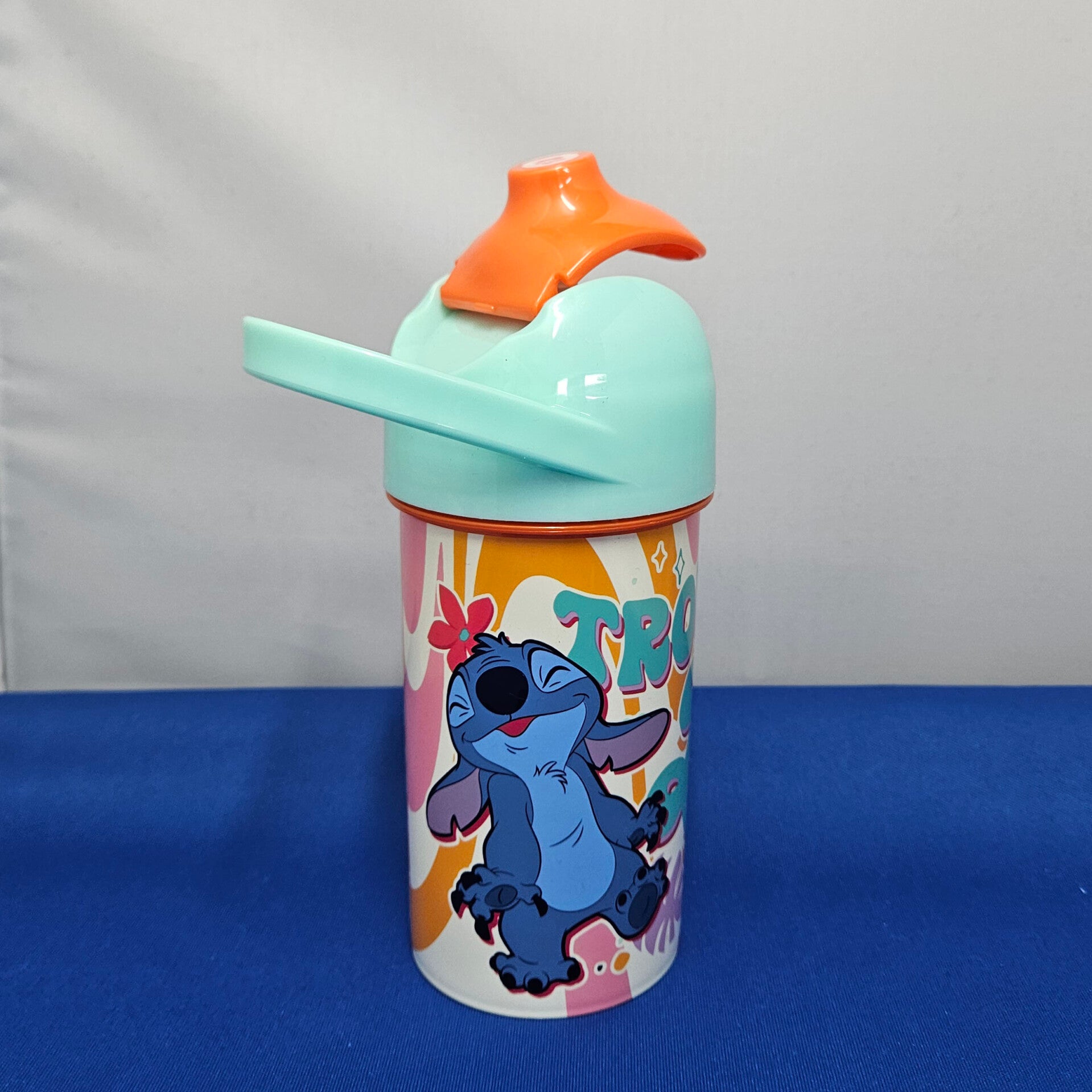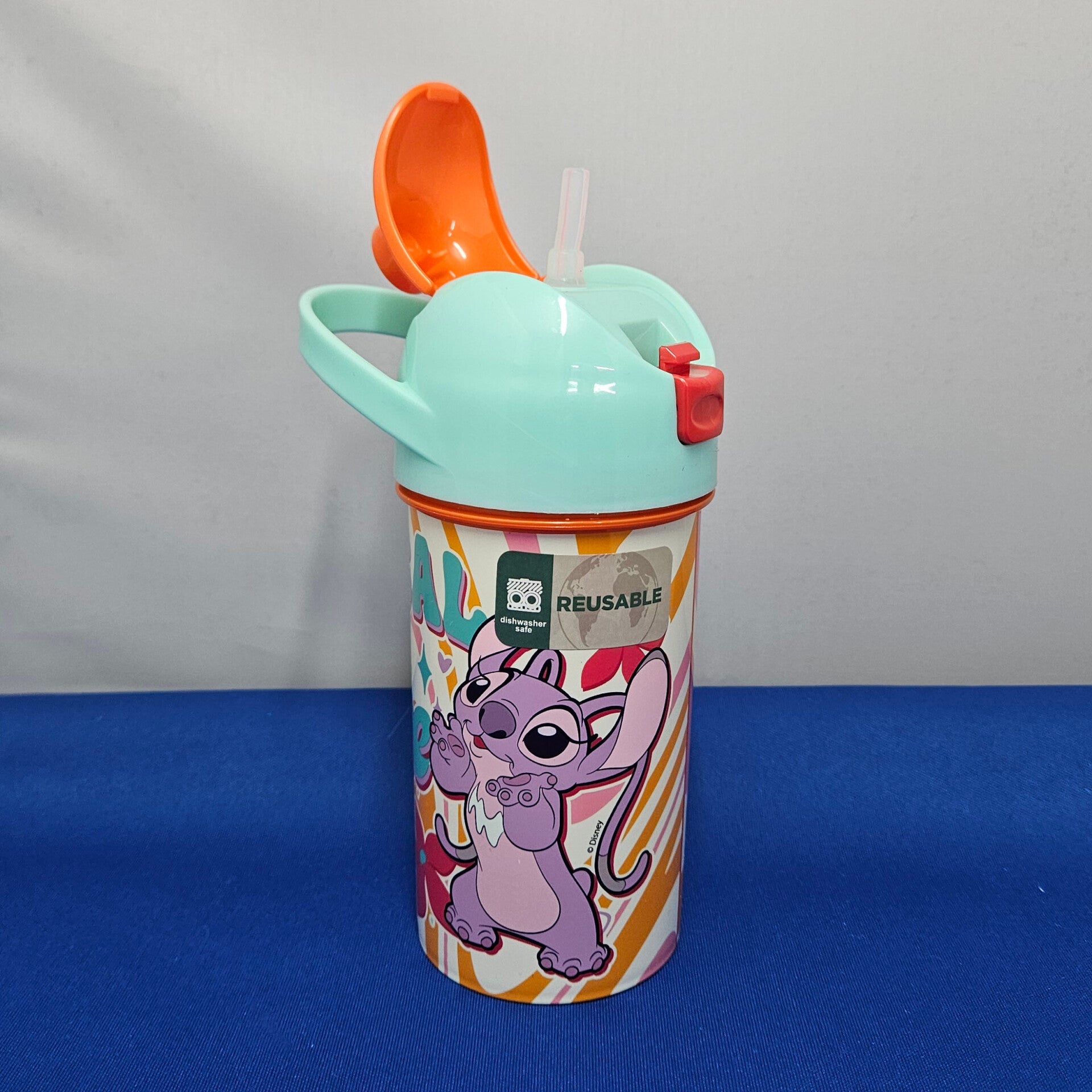 Stitch drinkbeker met een drinktuit en een sluitbaar deksel, het handvat zit stevig vast aan de dop.
